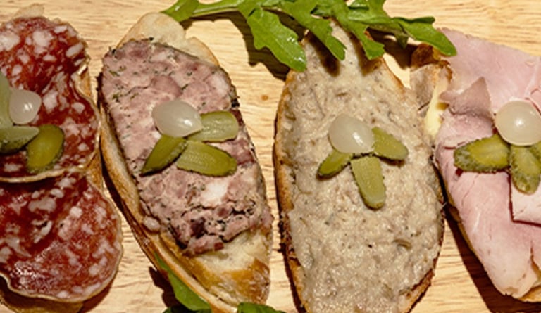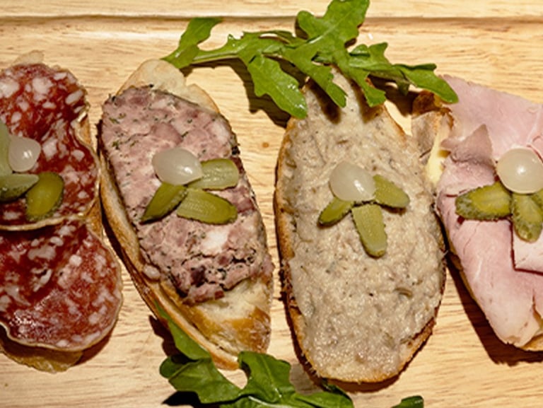 Pork Rilettes, Pork Pate, Rosette de Lyon, Jambon Beurre Gruyere : 450